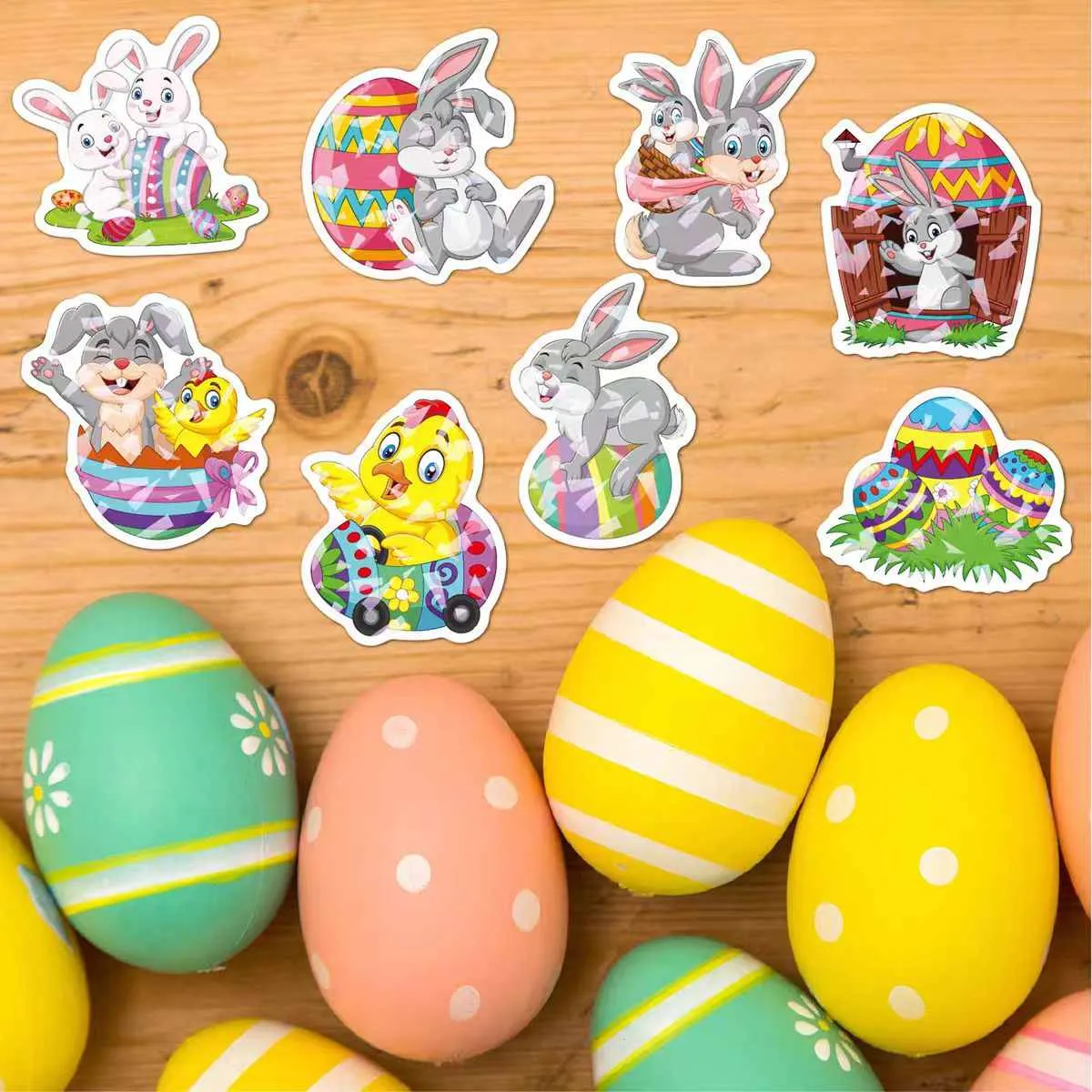 Сосредоточьтесь на пасхальных яйцах с креативным дизайном, включая классический горошек, цветочные узоры, мультяшных кроликов и стили с западной эстетикой. Полноцветная печать CMYK подчеркивает яркие пастельные оттенки и градиенты, создавая яркий праздничный вид.